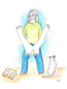While I was transgressing against each of these laws, I remembered that my ghostly supervisors would be appalled that I had simply folded over the bottom of the pants, instead of cutting off the old hem and then starting the new one. But sitting there, pushing the needle with my middle finger and periodically nudging the cat Telemann off my lap, it occurred to me that I should once and for all accept myself as a sloppy seamstress, and just get on with the task.
