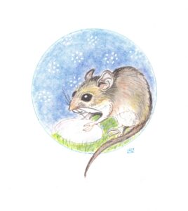 The drawing of the white-footed mouse holding a glass pebble is a fantasy, unless ours is a mouse with an innate sense of order and a love of beautiful, non-utilitarian objects—in other words, an artist. Other than that, as the days grow short and the season of mists and mellow fruitfulness sets in, the mystery continues.