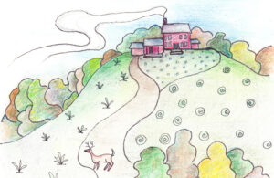 “Wolfie, with me!” I called, “find the chickens!” and we plunged into the woods. It was a hot day, and I was wearing a dress. Remember that scene in Walt Disney’s Snow White where she’s lost in the woods and the trees reach out and grab her dress? That was me this morning, stepping through brambles and over fallen logs, looking for that chicken. But I couldn’t even tell where Wolfie was, much less the chicken.